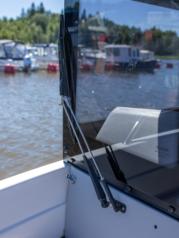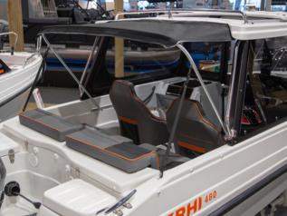 The cabin-equipped Terhi 480 C model offers sheltered seating for the driver and co-driver inside the cabin, while passagers are seated onto the stern bench.